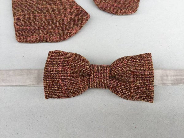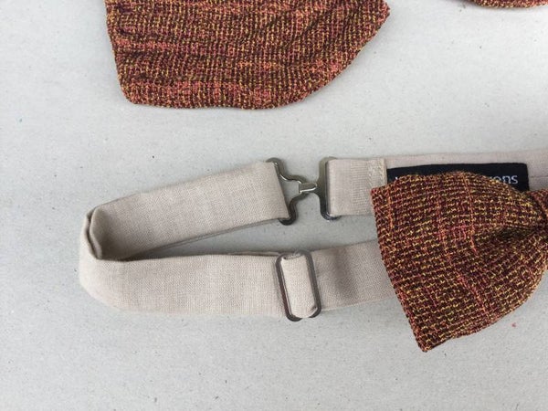 Deze cadeauset omvat 1 handgemaakte kraag en 1 bijpassende strik in roestbruin.