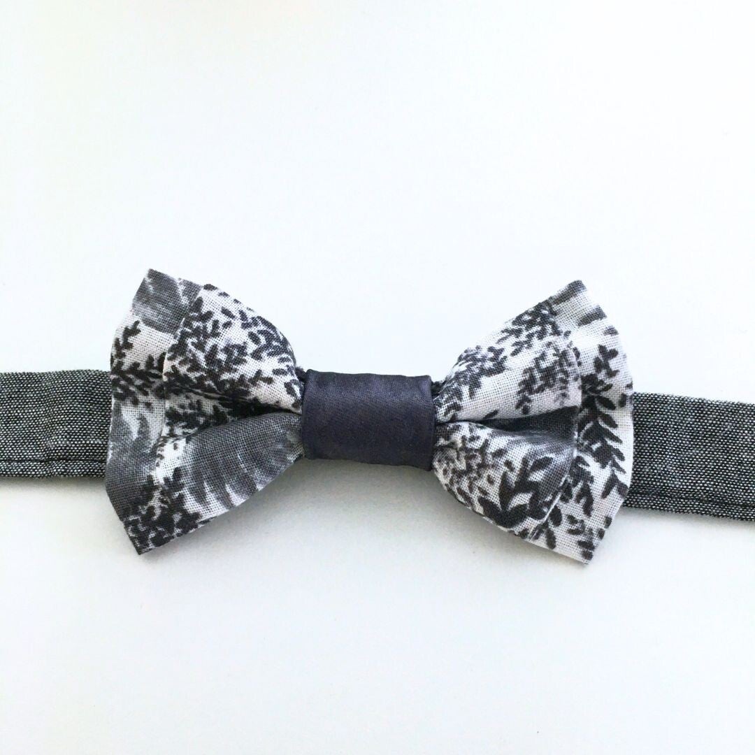 Handmade bow ties from white cotton with a grey plant print. The centre fabric is a poly-blend and has a delicate sheen to it.